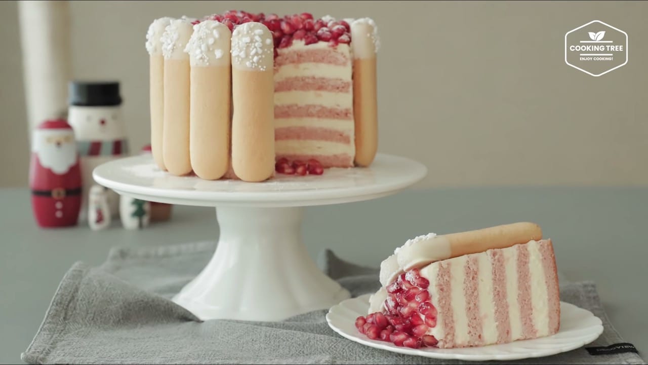 I made a Charlotte cake with a Christmas feeling by icing pink cream on white cake sheets and pomegranates.