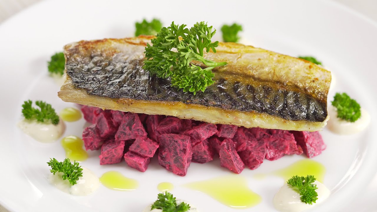 Cook a fried mackerel on a delicious bed of beet with horseradish cream sauce. You will need simply half an hour to receive rave reviews of your guests and family! Don’t be afraid it is beyond your ability to cook a proper mackerel fillet. That’s easy – watch our video recipe.